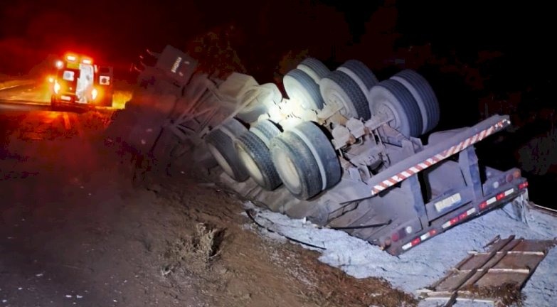 Carreta carregada com farelo tomba na MS-480 durante desvio de buracos