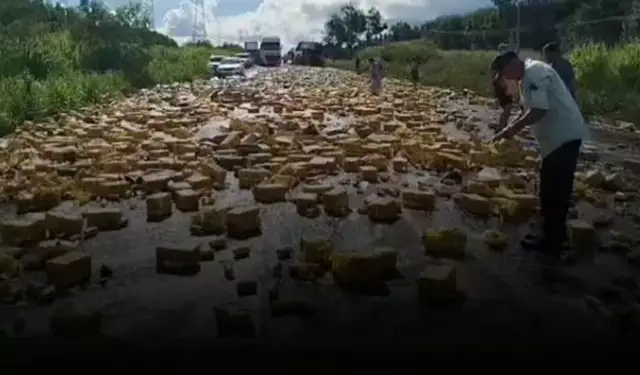 Carreta com carga de cerveja tomba na BR-262 e causa tumulto na rodovia