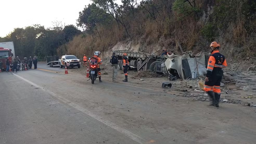 Caminhão com granito tomba e causa filas de 20 km na BR-381 em Sabará