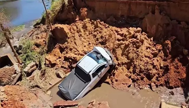 Motorista ignora alerta e picape cai em cratera na zona rural de Três Lagoas