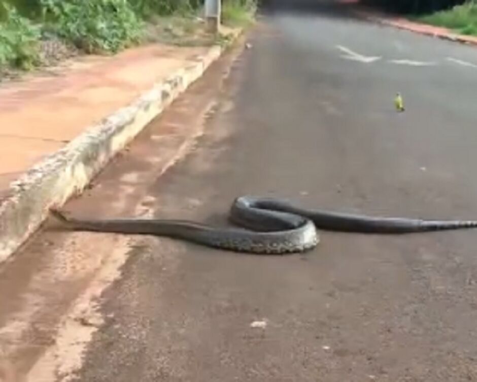 Morador flagra sucuri atravessando rua em Fátima do Sul