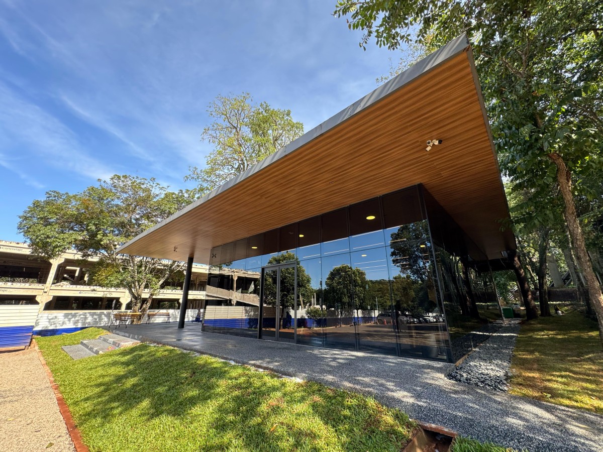 A fachada de vidro permite que os usuários do espaço contemplem a natureza do Parque dos Poderes.