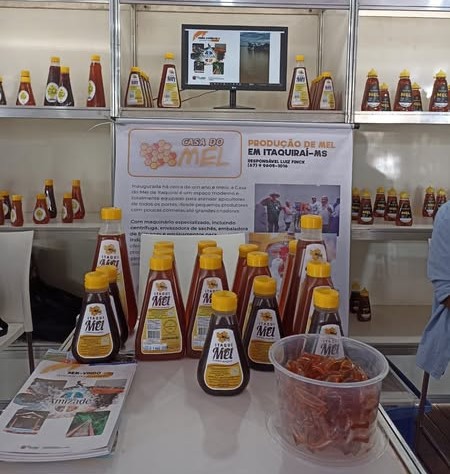 Exposição de produtos da Casa do Mel de Itaquiraí na RuralTur 2025, com destaque para o mel produzido por apicultores locais e material informativo sobre a produção do município. Foto: Divulgação/Assessoria.