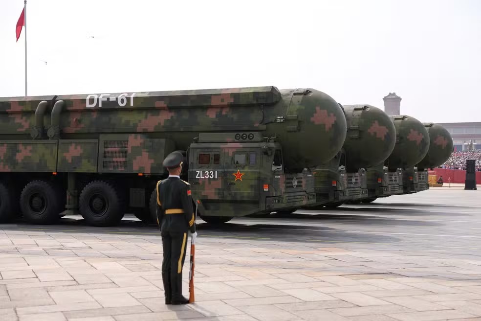 Entre os armamentos apresentados estão o DF-5C, com alcance de 20 mil km e múltiplas ogivas independentes, e o DF-61, míssil móvel de longo alcance. A tríade nuclear chinesa completa, que inclui mísseis lançados por submarinos (JL-3) e pelo ar (JL-1), reforça a estratégia de defesa do país, segundo a agência Xinhua.