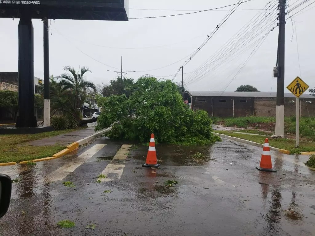 A rede elétrica também foi afetada, com fios arrebentados que ocasionaram a interrupção do fornecimento de energia em grande parte do município. A situação impactou diretamente o funcionamento de escolas, que suspenderam as aulas, e do semáforo localizado na área central, que ficou inoperante.