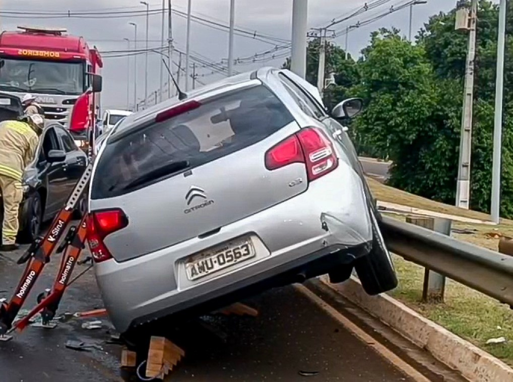 O Citroën C3 do idoso ficou parcialmente sobre o guardrail após ser atingido por um Honda Civic na avenida Prefeito Faria Lima, em Londrina; equipes do Corpo de Bombeiros prestaram atendimento no local. Foto: Divulgação.