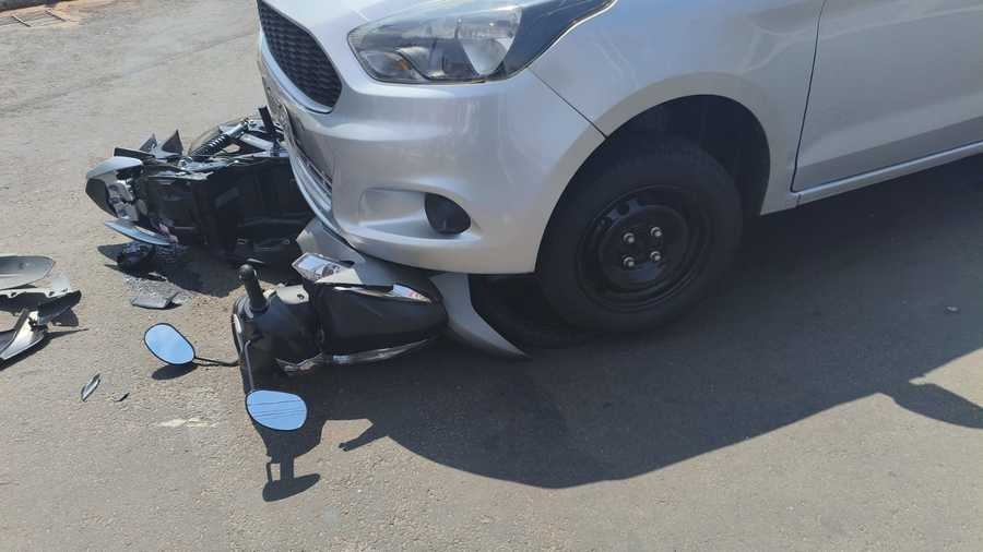 Carro colide com Honda Biz em Nova Andradina; motocicleta ficou parcialmente debaixo do veículo e sofreu danos significativos. Foto: Divulgação.