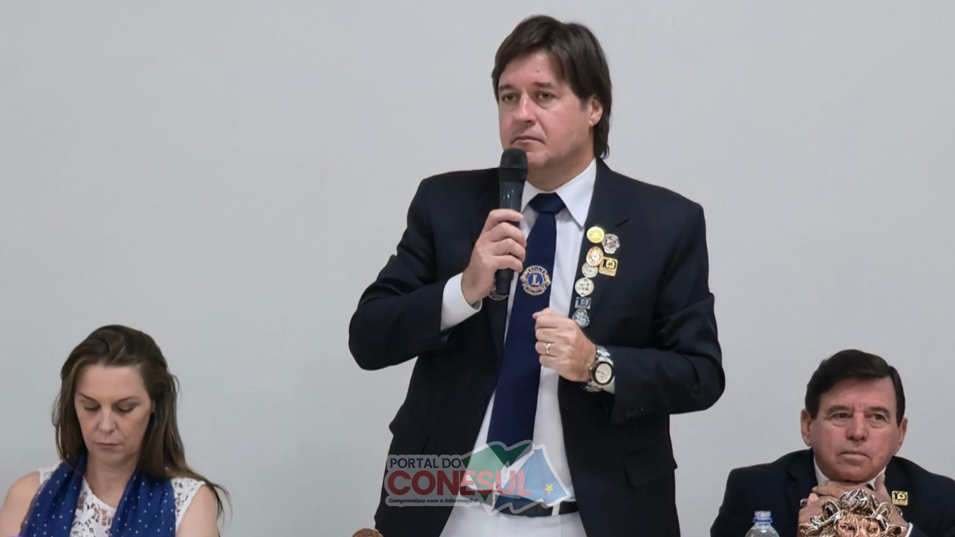 O presidente do Lions Clube de Naviraí, Juliano Pizzato, conduz a sessão solene de homenagens, destacando a importância da união e do legado dos companheiros leoninos. Crédito: José Luiz Bressa / Portal do Conesul.
