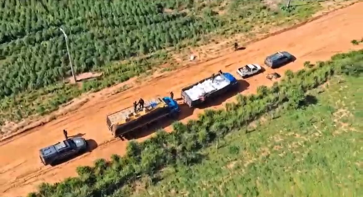 A equipe realizava um bloqueio na rodovia, conhecida como Estrada do Lixão, quando os motoristas, ao avistarem a presença policial, abandonaram os veículos e fugiram por uma plantação de mandioca em direção a uma área de mata.