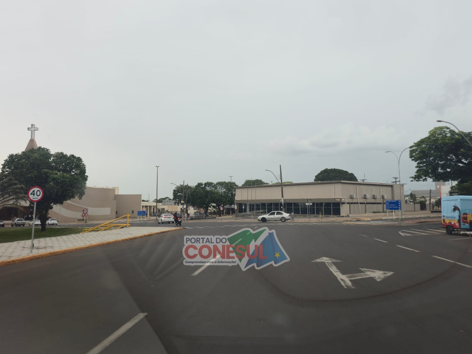 Avenida Dourados, uma das principais vias de Naviraí, sob um céu típico de domingo de verão: calor intenso e nuvens carregadas que anunciam as pancadas de chuva e trovoadas previstas para a tarde.