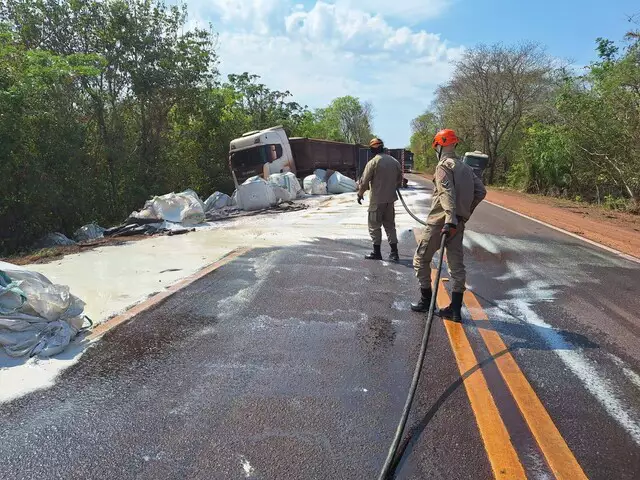 Caminhão em zigue-zague tomba na BR-262 e interdita totalmente a pista em Aquidauana