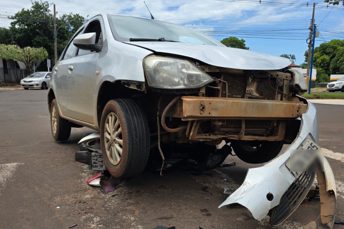 Colisão entre carro e moto em Naviraí deixa motociclista ferido; moto fica presa embaixo do carro